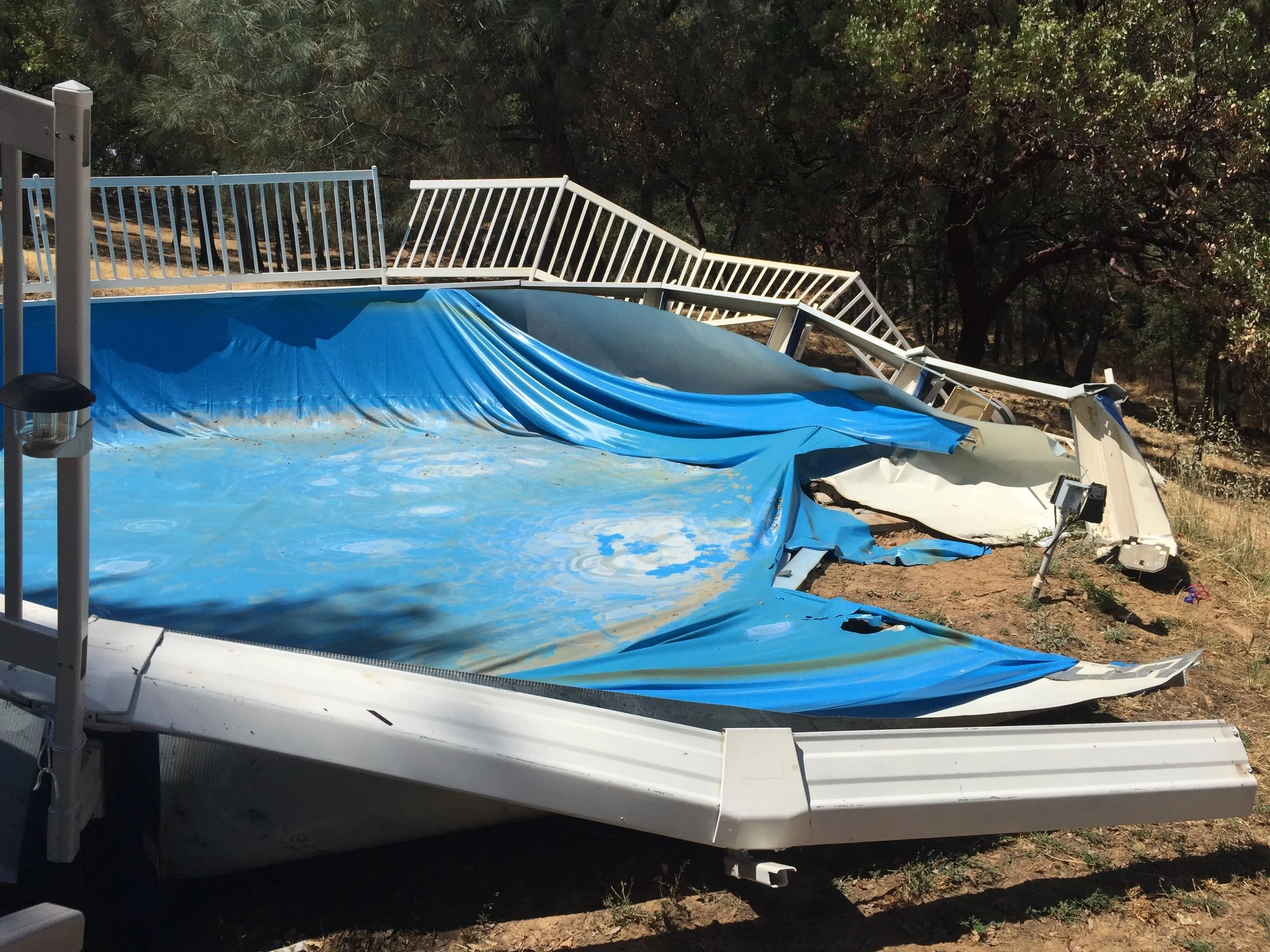 ......Doughboy Pools come with a slide bar which is engineered to withstand the immense water pressure these pools are under. So the installer decided to make this 28' round pool a 24' round pool by cutting the slide rail out and installing his own nuts and bolts to secure the wall. Didn't work out to well. This pool blew out with such force, it shot metal 25 feet up into a tree 50 feet from the pool. All of her kids were swimming 45 minutes prior to this happening. Needless to say, they are very thankful no one was hurt as the water hurdled down the back of the property wiping out the pool equipment and electrical hookup. People please hire reputable businesses who are licensed and insured so these mistakes will not happen. We have been in business for 23 years and have had not one pool collapse. Just remember, "Skilled labor isn't cheap, and cheap labor isn't skilled."